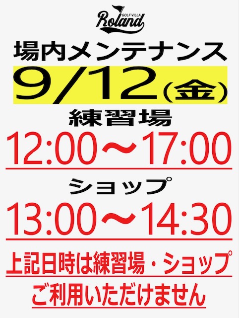 Published in: お知らせ 【再変更あり】9月度 タイム休業のお知らせ Author golfvilla Published on: 2025年8月31日 今月は、 練習場 12:00~17:00 ショップ 13:00~14:30 の間はご利用いただけません。 変更が重なり申し訳ございません。 ご迷惑をおかけいたしますがよろしくお願いいたします。